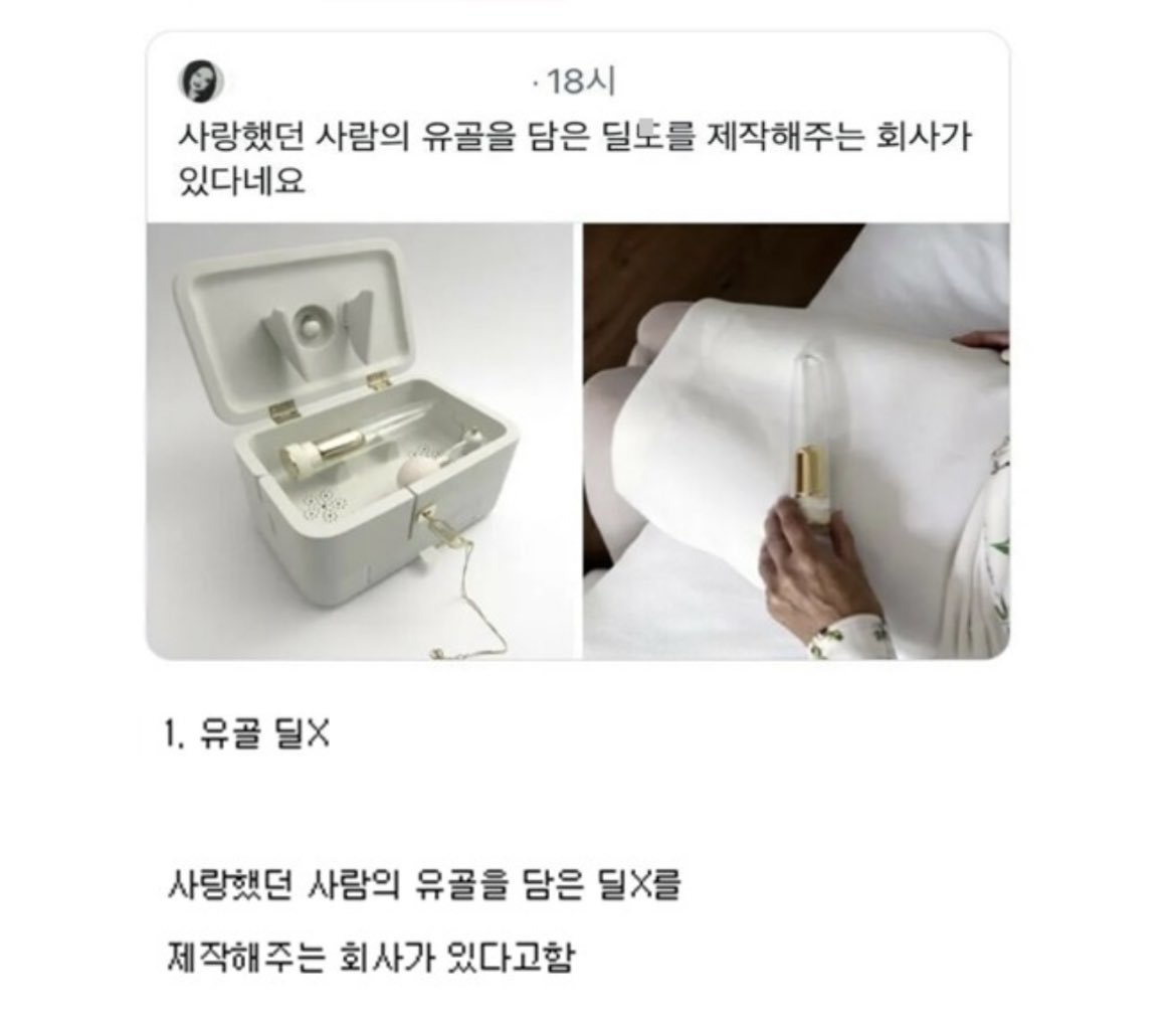 사랑했던 사람의 유골을 담은 딜도를 제작해주는 회사가 있다네요 작성자 정보 끼갈 작성 작성일 2023.01.30 16:18 컨텐츠 정보 107 조회 0 추천 0 비추천 목록 답글 본문 사랑했던 사람의 유골을 담은 딜도를 제작해주는 회사가 있다네요 0 추천 0 비추천 SNS 공유 관련자료 이전 오열 ㅠㅠ 작성일 2023.01.30 16:45 다음 여배우들 싸움 작성일 2023.01.30 16:16 댓글 0 등록된 댓글이 없습니다. Select File Upload File 목록 답글