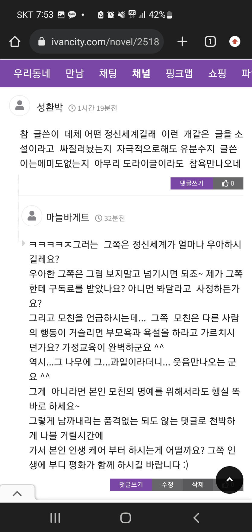 저는 비판이나 지적은 받아 들일지언정 ( 그래서 나름 힘들게 짜여진 글 하나를 연재중단 조치도 했죠)그쪽같은 무지성 욕설은 안참아요^^